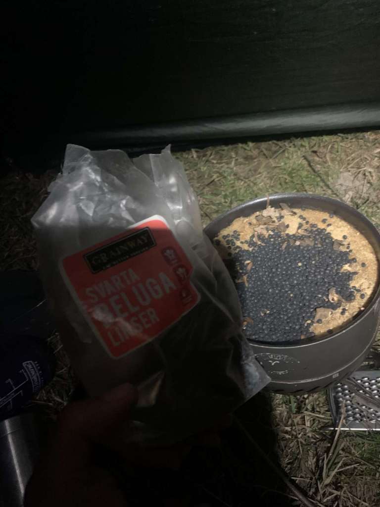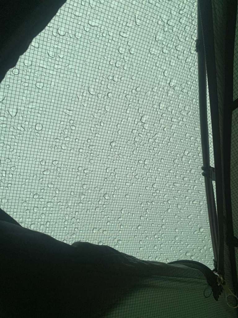 Jag cyklade på och vid 15 kom det utlovade regnet. Hittade en lämplig tältplats och hann få upp tältet och få in min packning i det innan skyfallet kom. Det är mysigt att sitta inne i tältet och lyssna till droppar som smattrar mot tältduken. När jag suttit i det nån timme så ökade regnets intensitet och smattrade inte bara längre utan det öste verkligen ned. Samtidigt kom vinden. Det blåste upp så hårt att jag snabbt fick slänga mig ut för att få upp stormlinorna. Enligt prognosen så blåste det upp mot 25 m/s i byarna och det verkade helt klart stämma. Med stormlinorna på plats kunde jag och Bounty sen chilla resten av kvällen.