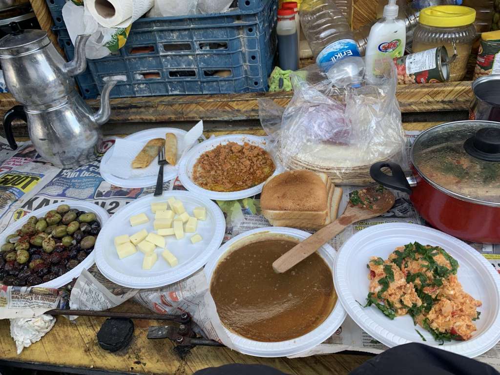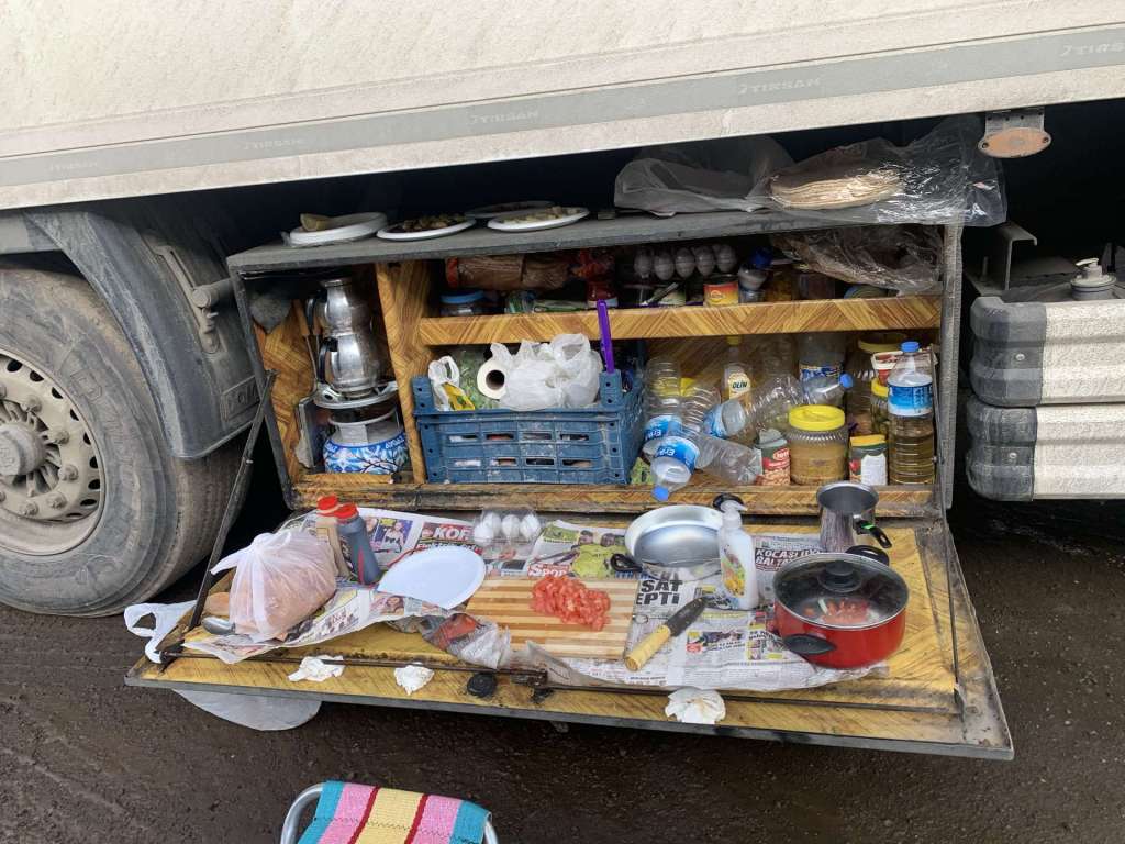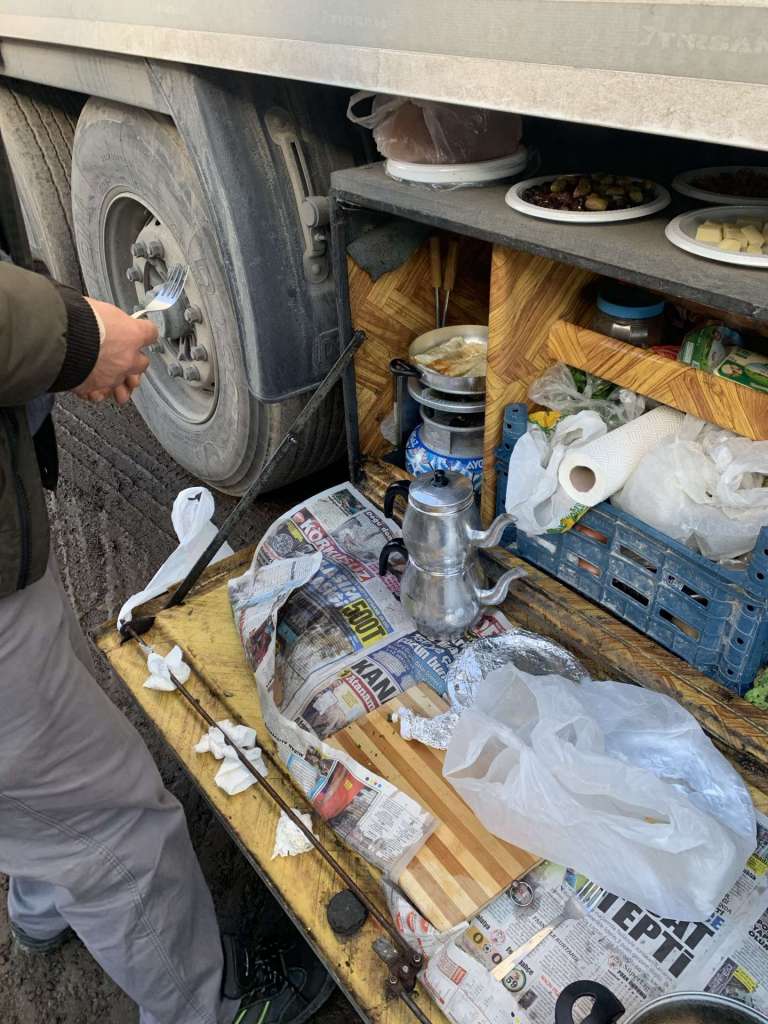 Det blev en lugn och trevlig start på dagen. Jag packade ut mig från motellrummet och gick ut till lastbilsparkeringen och mötte upp Deniz som ställt iordning en stor frukost! På samma parkering fanns även hans farbror som också kom till frukosten samt en random chaufför från parkeringen. Morgonen var kall och blåsten gjorde att den kändes ännu kallare. Men jag var omgiven av varma människor. Det blev mycket skratt. Härlig start på dagen helt enkelt!
